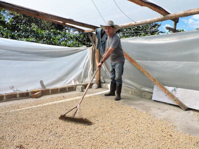 ロス・ピノス農園の生産処理においては、収穫も品種によって適切なタイミングを定めており、ピンクブルボン種は深いサーモンピンクに熟したタイミングをベストとしています。この完熟したチェリーのみを収穫し、収穫後は一度袋に入れチェリーの状態で発酵工程を踏んでいるのが特徴です。その後、果肉除去を行い、今度は発酵槽で3日間かけてミューシレージ成分を分解させます。チェリーでの発酵は華やかで重厚な風味を齎すためと言い、発酵槽での3日間の発酵工程は標高が高く気温が低い環境ゆえに分厚いミューシレージの分解に時間が掛かるためです。また、発酵槽やパルパーの清掃・手入れにも余念がありません。乾燥場は通気の取れたパラボラ式の乾燥場で10日前後かけて乾燥させます。均一に乾燥できるように1日3回定期的に攪拌を行い、日々一定量を脱殻して、生豆の色を見ながら乾燥状態を見極めています。